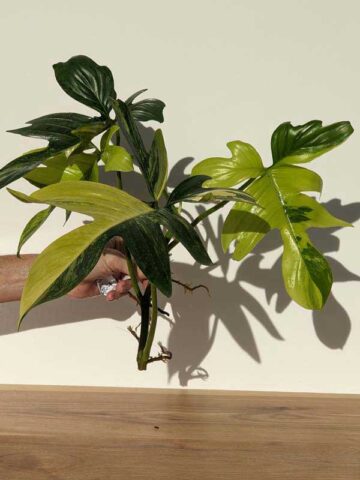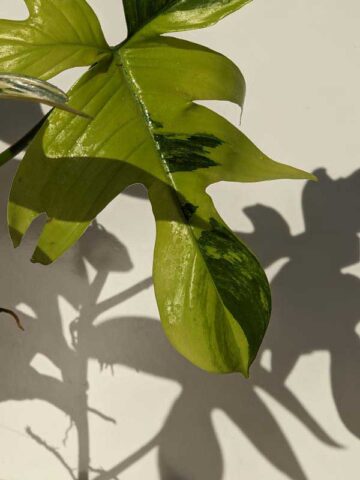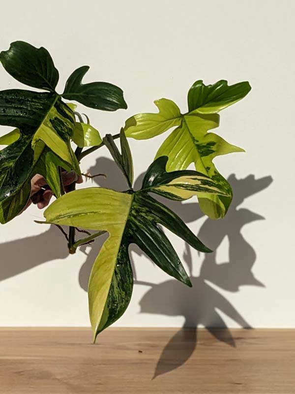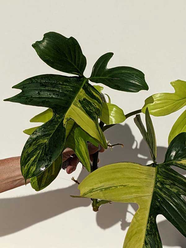 Pedatum Variegata vs Florida Variegated, Pedatum has shorter node spacing, much more consistent variegation, Florida Variegated is a stringier plant and more difficult to hold the variegation but it does have red petioles while Pedatums are green and often striped with yellow. Leaves can be anything from solid neon yellow to deep green. This is one of our favorite Phils.