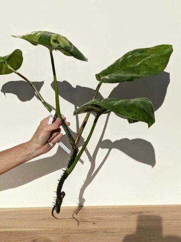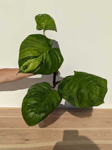 This rare, massive pothos sports yellowish-green mottled leaves and relatively short node spacing which makes it a great choice for indoor growing in hanging baskets or on your sunny windowsill. As with most Pothos varieties, when allowed to climb, the leaves and vine will grow much larger in size, leaves can reach 15 inches or more across. This variety in particular grows larger faster than most other pothos. Occasionally leaves will vary on the degree of variegation and rarely some side shoots leaves may have very bright or sometimes white variegation or no variegation at all. Simple Trick, simply trim the unwanted vines just after the last variegated leaf and the new shoots should be back to normal.