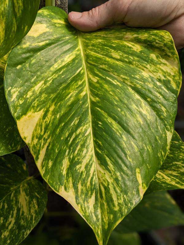 Transform your environment into a tropical oasis with Pothos. Pothos consistently ranks as one of our most popular houseplant for five years running. These versatile plants thrive indoors or outdoors, in hanging baskets, on totems, or trellised locations. Imagine your home adorned with long trailing vines of heart-shaped leaves, creating an atmosphere of nature's tranquility. Caring for Pothos is simple. Plant them in average potting soil, nourish them bi-monthly with a liquid houseplant fertilizer, and water thoroughly, allowing them to dry out between watering's. This effortless caring routine ensures their optimal growth. In warmer climates introduce Pothos to your outdoor space and watch as they transform into stunning climbers with huge tropical fenestrated (split) leaves often reaching two feet in diameter.