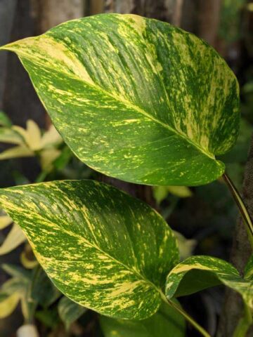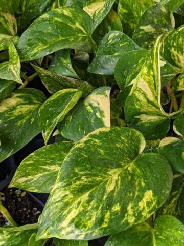 Japan Sfida Pothos Pothos is a unique variety of Epipremnum Aureum. It features heart-shaped leaves with striking variegation. This plant is a mutation of the Valencia pothos, known for its distinctive leaf shape and color speckling. The deep green base color contrasts beautifully with lighter shades of green or yellow. Its eye-catching appearance makes it a favorite among plant enthusiasts. Additionally, the Japan Sfida Pothos is relatively easy to care for and has a trailing growth habit, enhancing its appeal as a houseplant. When climbing outdoors this pothos leaves will grow up to 10″ in diameter with a tropical split leaf form.