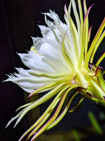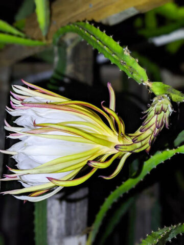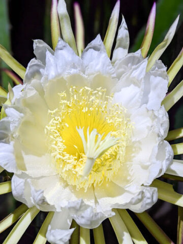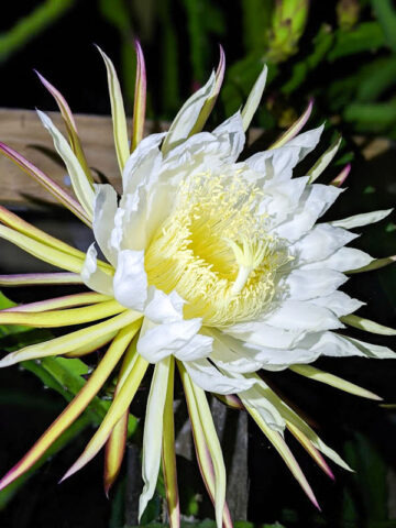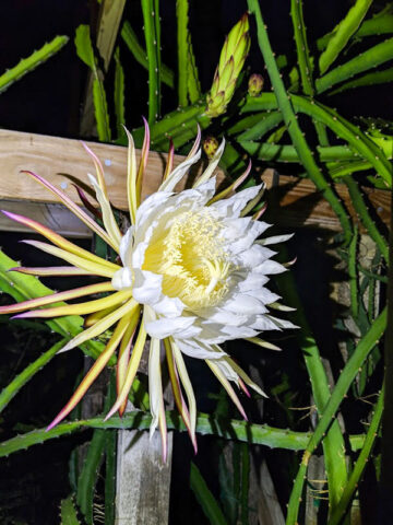 The fruits produced are florescent pink inside edible and sweet. A hedge of this plant in full bloom is an unforgettable sight! Easily adapted to a variety of climates and soils this night blooming cactus is cultivated around the world in tropical regions for the fruit it bears. The white flowers are beautiful and usually last just one night where pollination is necessary to set fruit. This one is our favorite and was the first in our collection in 1998.