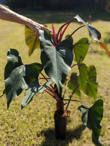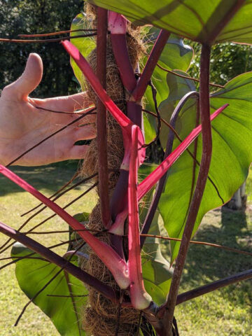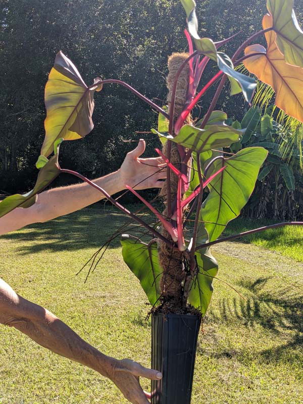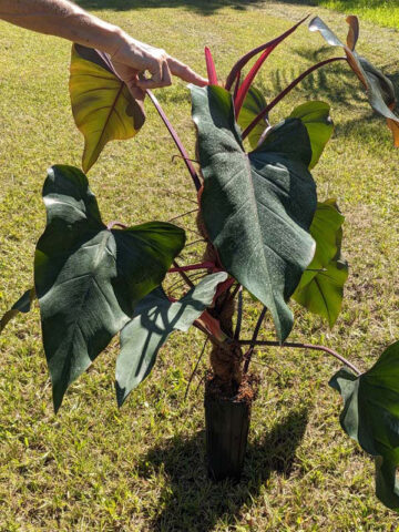 Dark Lord is a giant must have. The foliage on this philodendron begins deep orange, changes to blood red and finally to a deep dark green top with a metallic maroon underside. This plant is very easy to grow and it’s hard to keep small. The huge bright red stems can reach 1 inch in diameter. These are very healthy, climbing tropical plants with well established root systems.Pot Size: 4x4x9" Deep