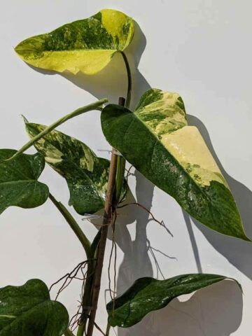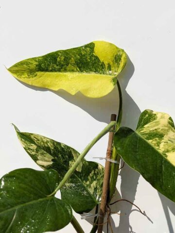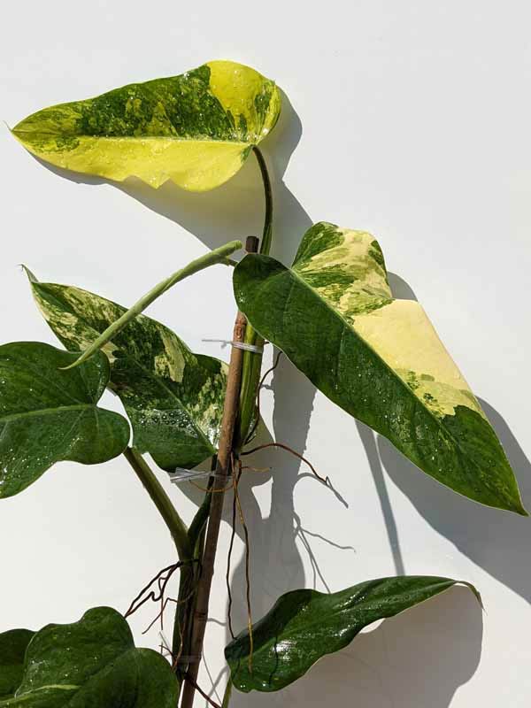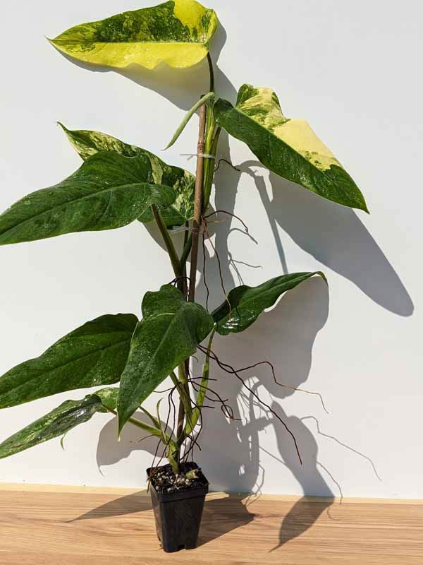 Rare Domesticum Variegatum – A new variety of climbing variegated philodendron which has inconsistent variegation most on all leaves. Allowed to grow untrimmed you will see a medley of leaves with some highly variegated and others not variegated at all. A very beautiful, collectible specimen plant. When growing on a coco pole the nodes will tighten up to two inches or so creating a gorgeous, full, colorful plant. These are very healthy, climbing tropical plants with well established root systems.