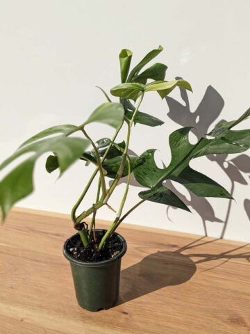 Rhaphidophora Tetrasperma Variegated Mint HIGH COLOR, Petite iconic Monstera shaped leaves of tree frog green, cream, and lime, unfurl with fenestrations down the midrib and pinnation in a random fashion. To protect the variegation from sunburn, leaves turn to jungle green after a few days. The thick, firm, and sturdy stem is a series of short heavily rooted nodes with long outward flowing petioles leading to the truly tropical little leaves. Rhaphidophora are very easy to grow and prolific when allowed to climb to lofty heights on an indoor totem or outdoors up your favorite tree. These are very healthy, climbing tropical plants with well established root systems.
