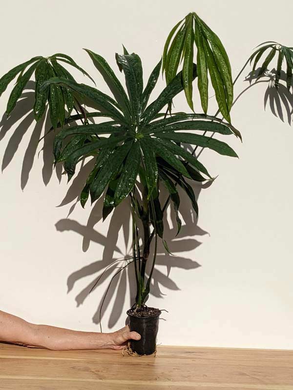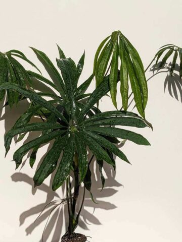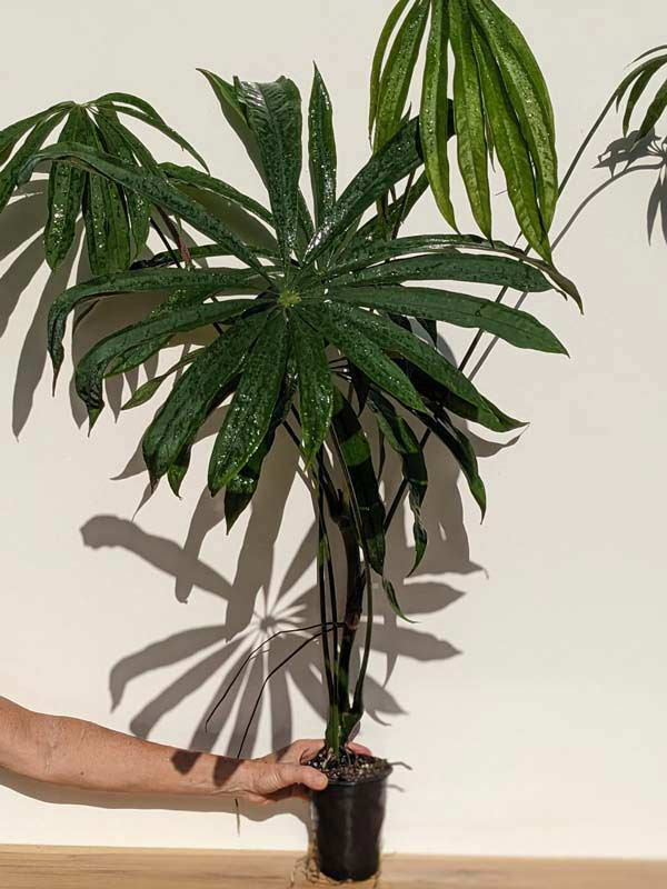Anthurium Polydactylon – This new, greatly desired species of Anthurium from Ecuador sports large Schefflera like leaves growing from a heavily rooted stem. Any large Moss wrapped totem is recommended for stability. This one is one of our favorite easy to maintain climbers. These are very healthy tropical plants with well established root systems.