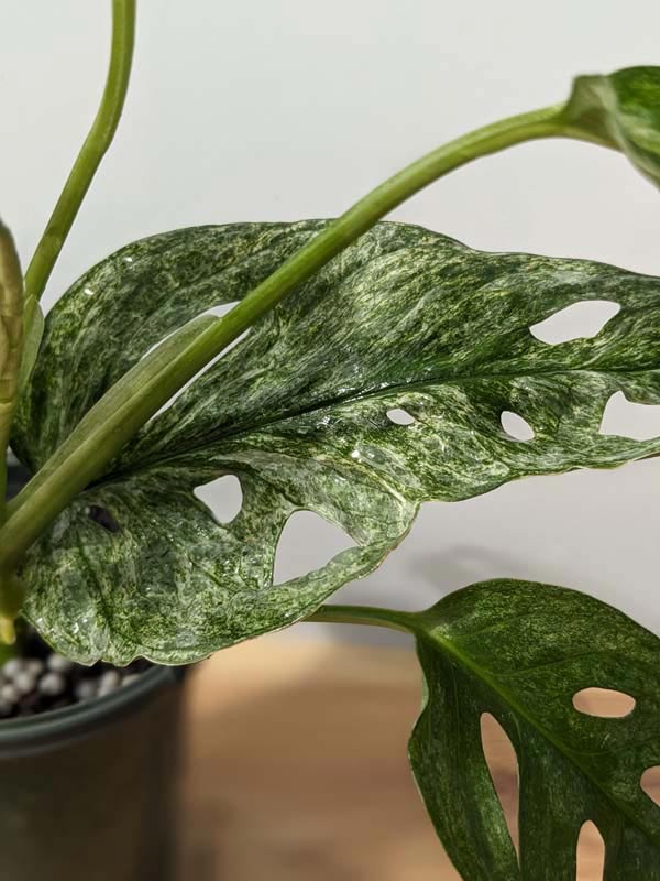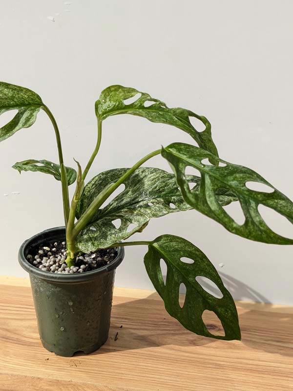 This is an excellent specimen plant with strong variegation. Monstera Adansonii European Mint Variegated is an ever-changing, climbing Monstera with beautiful variegated leaves. The growth habit is very unusual, leaves begin with very large holes with a stained glass look, variegation is very stable and often has a transparent appearance which becomes more pronounced when grown in brighter light. This is a somewhat smaller, more manageable variety of Monstera, highly recommended for indoor growing. When allowed to climb, the maturing foliage can grow 10 to 12 inches long with the iconic split leaf appearance. This rare plant is an absolute no-brainer and a must for any serious collector!